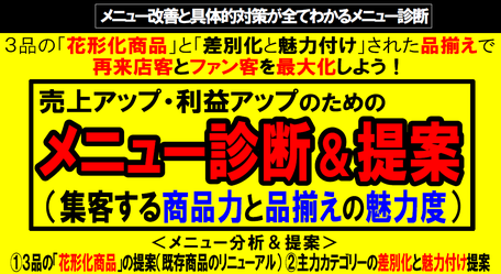 最新集客事例とその具体写真が満載のレポート『繁盛のルール化』を刊行。営業中の店舗に訪問し、後日その店の活性化具体策を提案する『集客力診断』を全国で実施している。